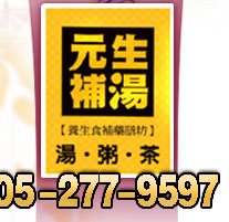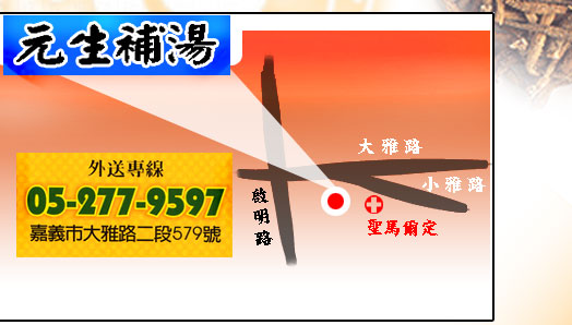元生補湯小吃店 電 話 : (05)2779597 住 址 : 嘉義市大雅路二段579號